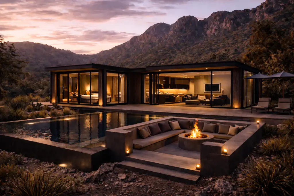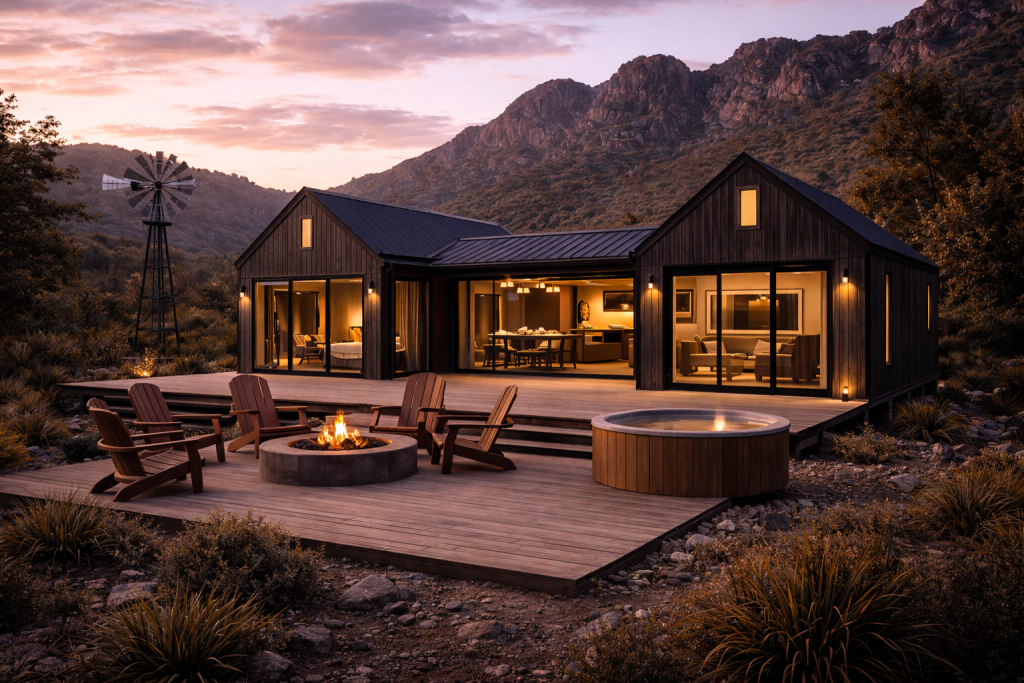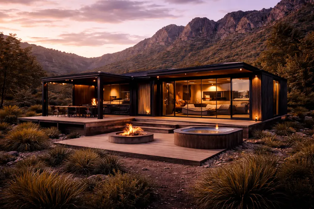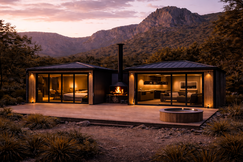 Warm modern retreats designed around outdoor living. The Ember Duo focuses on indoor–outdoor connection, with view-facing decks, braai areas, and relaxed living spaces designed for mountain landscapes.