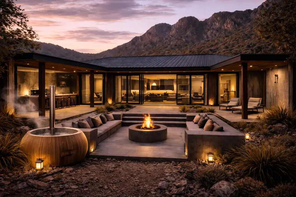 The ultimate pod designed around a private courtyard that creates sheltered outdoor living and strong connection to nature with an outdoor kitchen/bar, firepit with seating and egg shell Kol Kol Hot Tub.